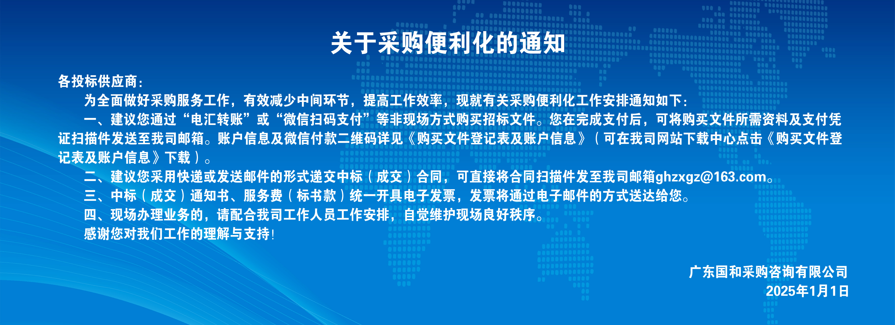 關(guān)于我公司2026年元旦放假安排的通知2025-12-30 熱烈祝賀我公司榮獲招標(biāo)代理機(jī)構(gòu)信用評(píng)價(jià)AAA級(jí)證書(shū)2025-12-30 省招標(biāo)投標(biāo)協(xié)會(huì)何毅秘書(shū)長(zhǎng)一行蒞臨國(guó)和咨詢(xún)調(diào)研2025-12-26 廣東省招標(biāo)投標(biāo)職業(yè)道德標(biāo)準(zhǔn)2025-04-29 廣東省招標(biāo)投標(biāo)行業(yè)自律公約2025-04-29 關(guān)于我公司2025年國(guó)慶節(jié)、中秋節(jié)放假安排的通知2025-09-26 廣州市防汛防旱防風(fēng)總指揮部關(guān)于終止“五停”措施的通告2025-09-24