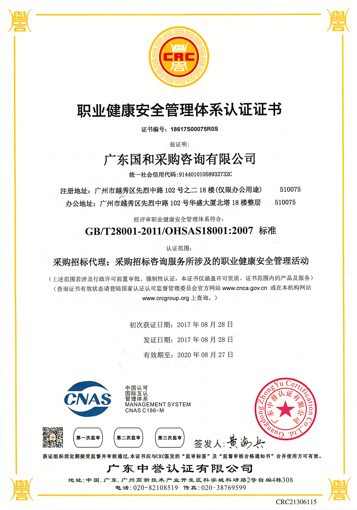 職業(yè)健康安全管理體系認證證書