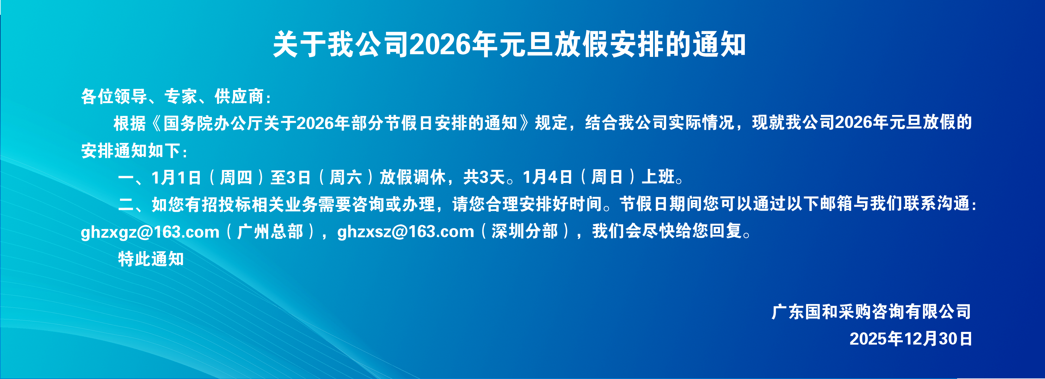 關(guān)于我公司2026年元旦放假安排的通知2025-12-30 熱烈祝賀我公司榮獲招標(biāo)代理機(jī)構(gòu)信用評(píng)價(jià)AAA級(jí)證書(shū)2025-12-30 省招標(biāo)投標(biāo)協(xié)會(huì)何毅秘書(shū)長(zhǎng)一行蒞臨國(guó)和咨詢(xún)調(diào)研2025-12-26 廣東省招標(biāo)投標(biāo)職業(yè)道德標(biāo)準(zhǔn)2025-04-29 廣東省招標(biāo)投標(biāo)行業(yè)自律公約2025-04-29 關(guān)于我公司2025年國(guó)慶節(jié)、中秋節(jié)放假安排的通知2025-09-26 廣州市防汛防旱防風(fēng)總指揮部關(guān)于終止“五停”措施的通告2025-09-24